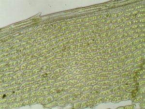 Alors, il est vrai qu’il y a les plantes. Là, les cellules se voient clairement. Exemple, une feuille de mousse observée au microscope x150 :